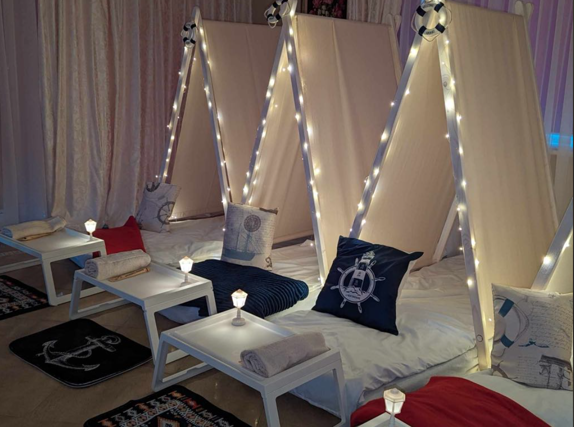 Į nuomos kainą yra įtraukta: palapinių komplektų pristatymas, surinkimas, atsiėmimas, patalynės, rankšluosčių skalbimas.
